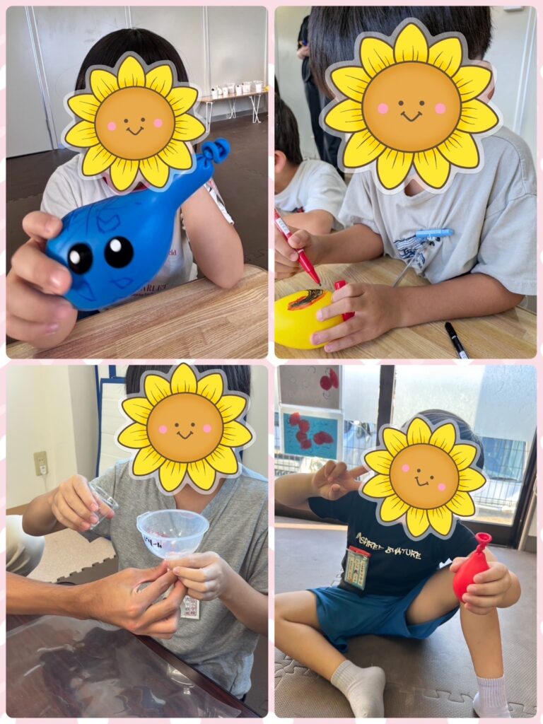 「えっ、風船の中に入れるの?」「こぼさないように…」と、みんな真剣な表情です。