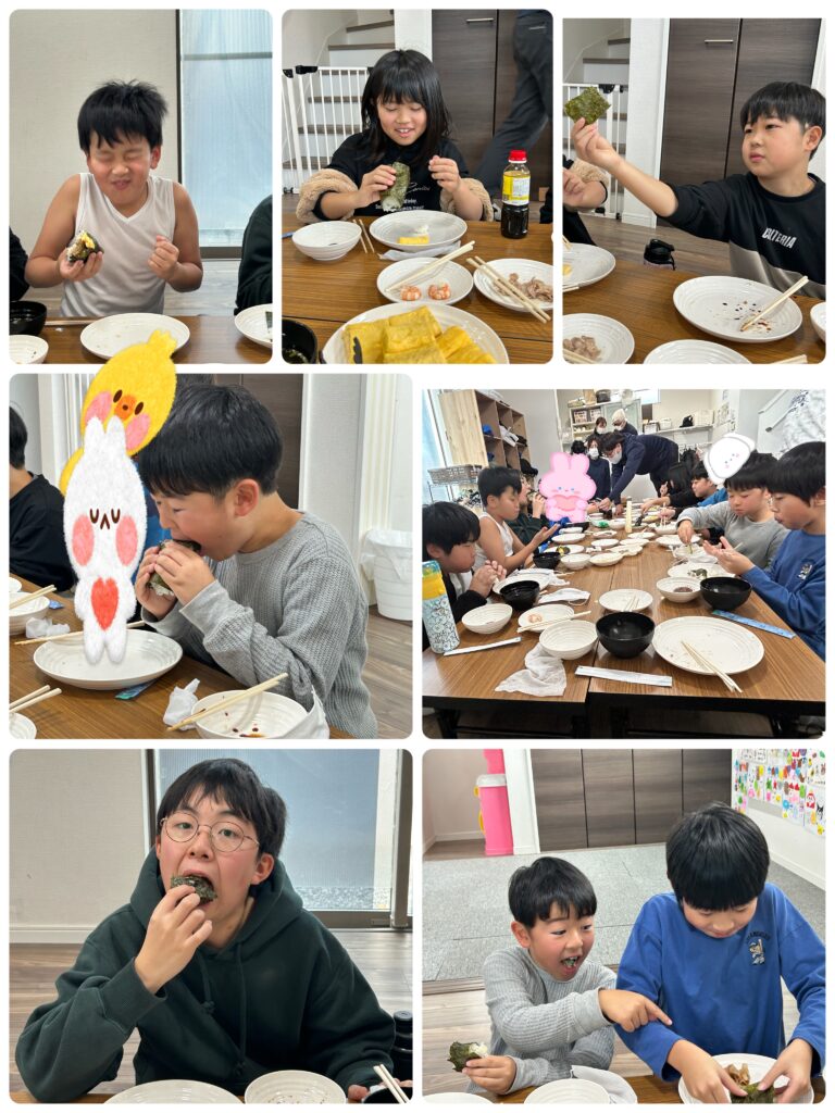海苔とご飯の上に、食べたい具材を乗せていきます!「ハンバーグ美味しい😆」「乗せすぎちゃった💦」と、ボリューム満点の手巻き寿司を大きな一口でかぶりついたり、節分の恵方巻を意識して無言で食べられるお子様がいらっしゃいました!